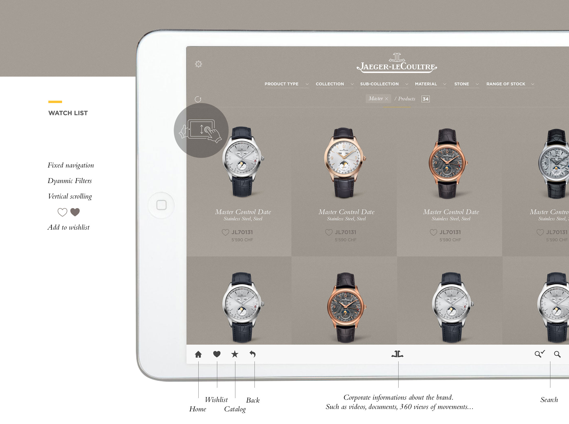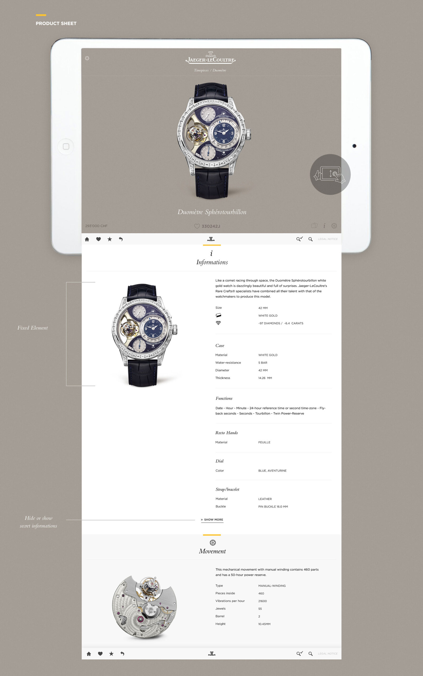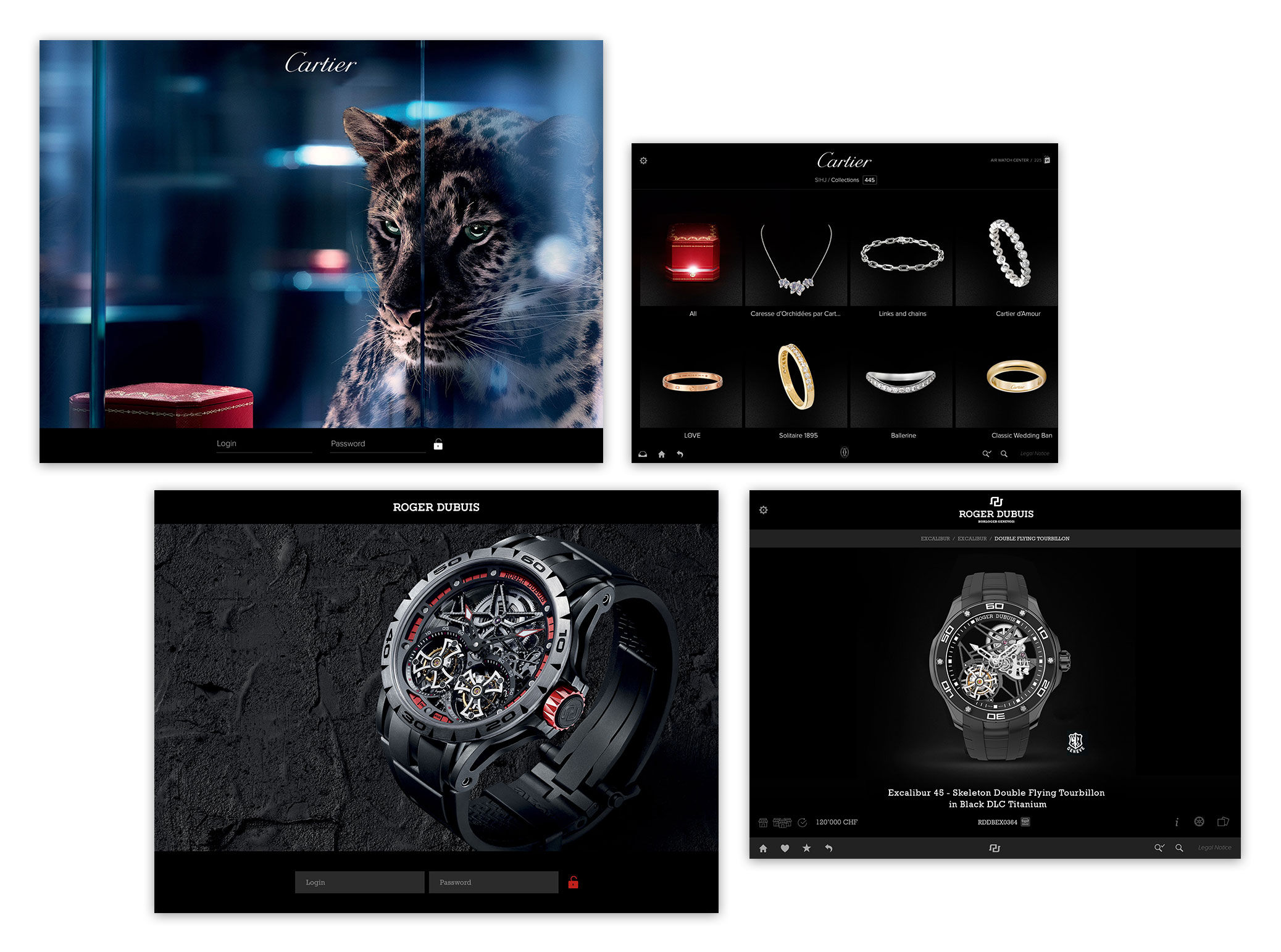 Nous avons créé une interface flexible et luxueuse, facilement adaptable à différentes marques du prestigieux groupe Richemont. Des designs “pixel perfect” ont été livrés aux développeurs iPad, avec qui j’ai coordonné l’implémentation finale.